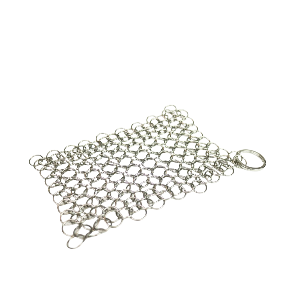 - Valhal čistač od lančane mreže (VH12CM) – Izdržljiv čistač od nehrđajućeg čelika koji učinkovito uklanja zagorjele ostatke hrane bez oštećivanja prirodne patine. Omogućuje temeljito čišćenje bez deterdženata i može se koristiti neograničen broj puta.