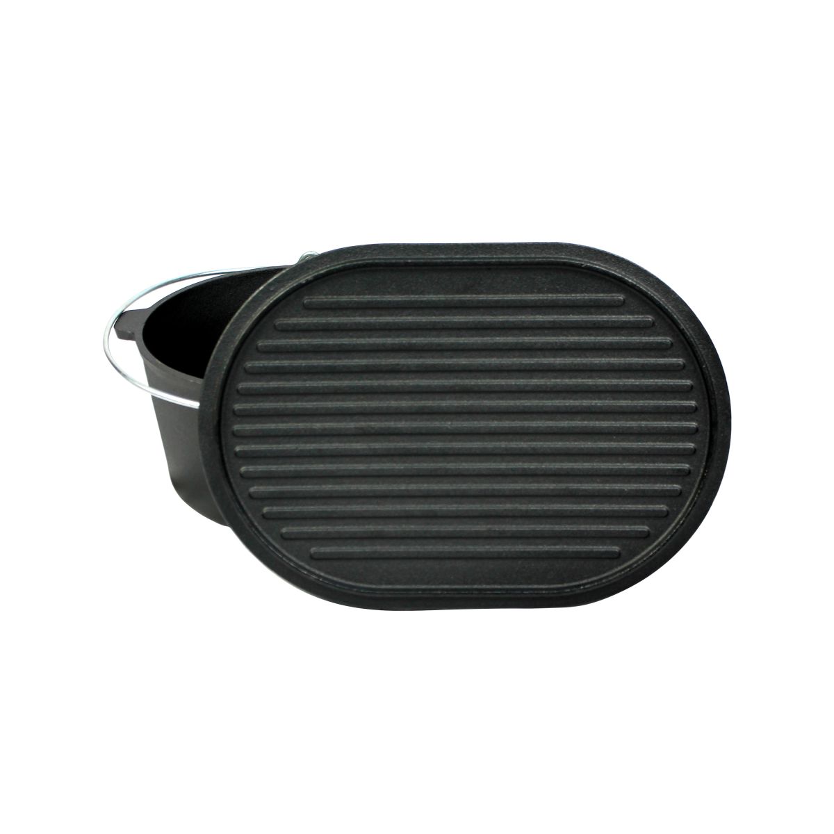 VH9L Dutch Oven izrađen je od lijevanog željeza, ima jedinstveni ovalni oblik, a poklopac ima povišeni rub. Lijevano željezo je materijal koji odlično provodi i zadržava toplinu te je pogodan za sve izvore topline. Zbog svog ovalnog oblika, ovaj Dutch Oven idealan je za pečenje najljepših kruhova. Zahvaljujući povišenom rubu poklopca, na njega možete postaviti ugljen i tako unutar lonca stvoriti funkciju pećnice. Budući da poklopac ima grill uzorak na dnu, ovaj Dutch Oven možete koristiti za razna jela.